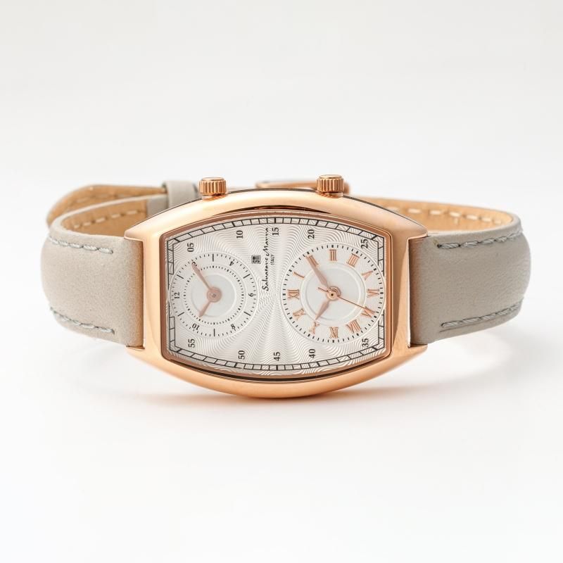 小ぶりながらも文字盤に施されたギョーシェ加工が放つ高級感は抜群。